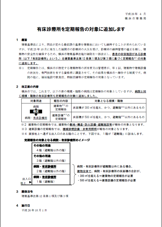 神奈川県横浜市は、平成25年10月に起きた福岡市の整形外科医院火災事故を受けて、横浜市建築基準法施行細則の一部を改正しました。これにより「有床診療所」(患者の収容施設がある診療所)が定期報告の対象となります。